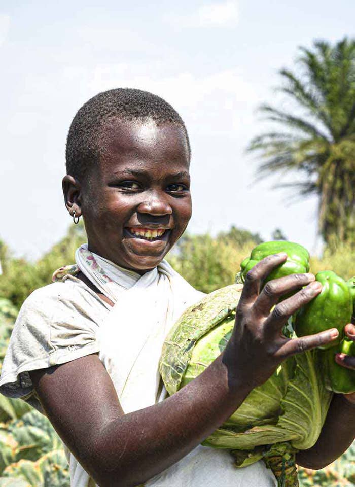 Estha smiles, with arms full of the produce harvested by her family. Her mother, Abenita, is a member of the Kisharo farmers group. This group harvests more than 10 tons of cabbage and other vegetables each season. Raw Hope has provided seeds and agricultural training every year since 2020. This program aims to help fight malnutrition in children and increase household income through agricultural activities.