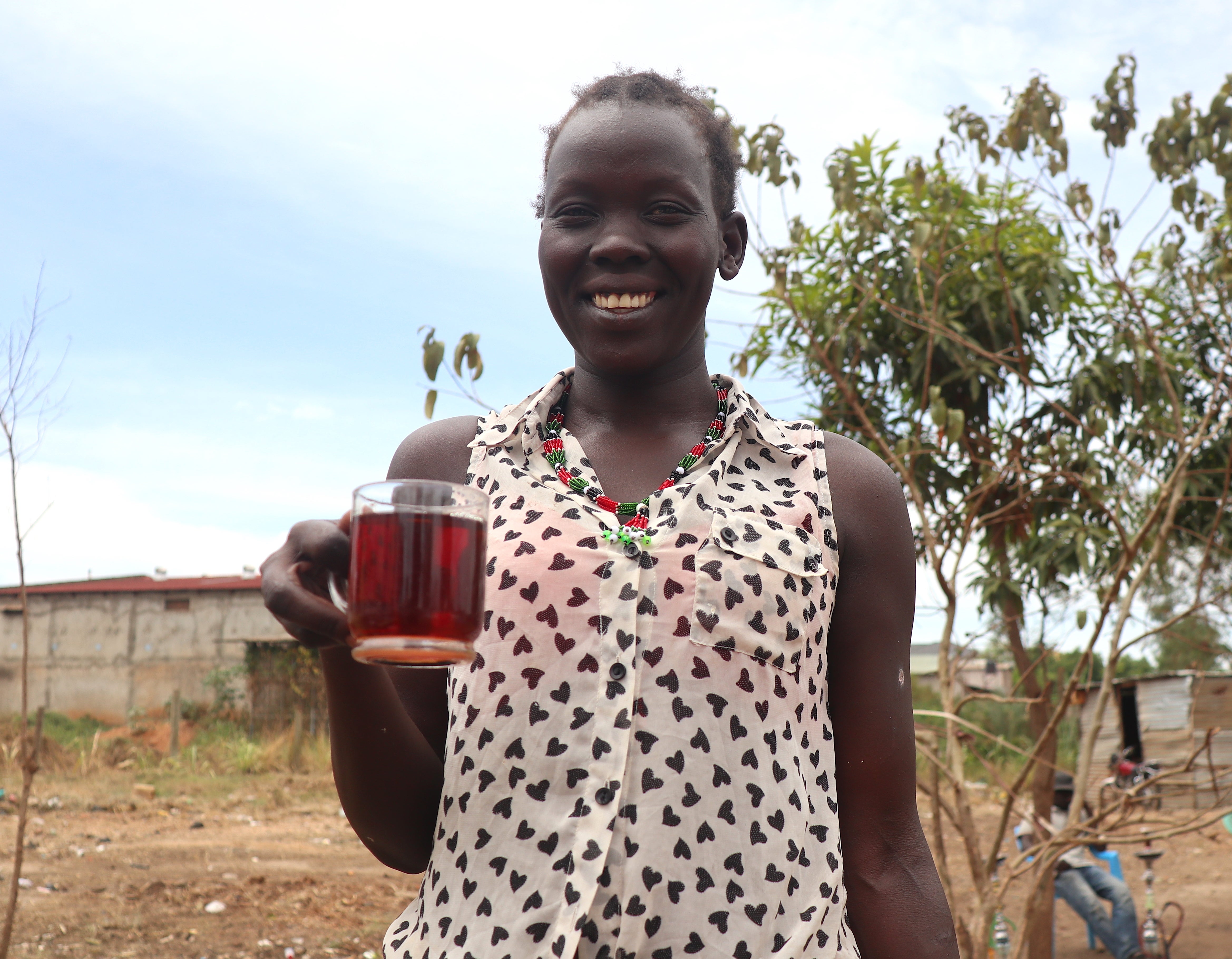 Merry (with kettle) at her tea store that also employs other women. Some tables, chairs and a few basics were all they needed to begin. They bring the tea leaves in from Uganda