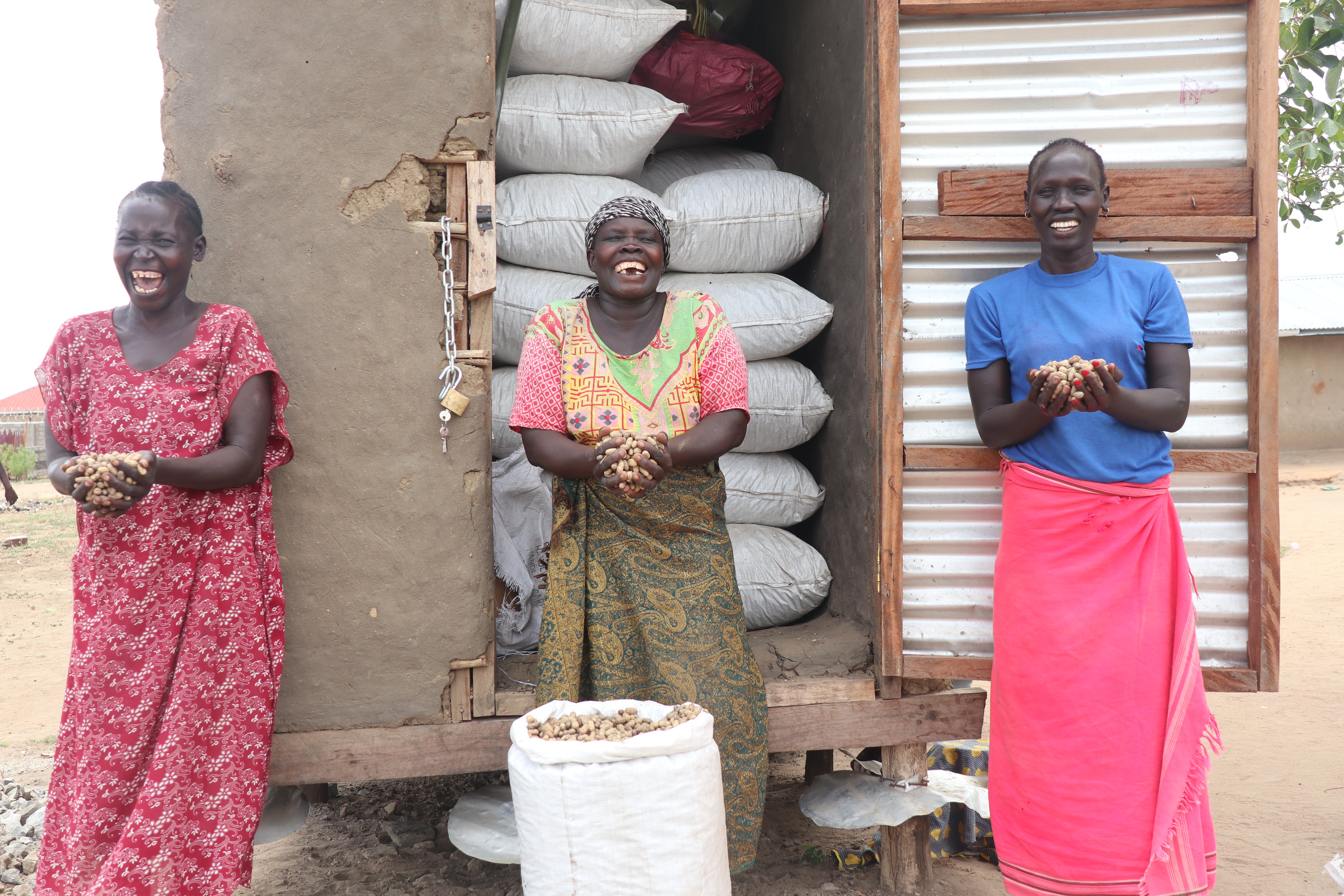 Friends and business owners. Mary Pita (left), Elder Atim (middle), Grace Abau (Right) are all smiles about their peanuts harvest